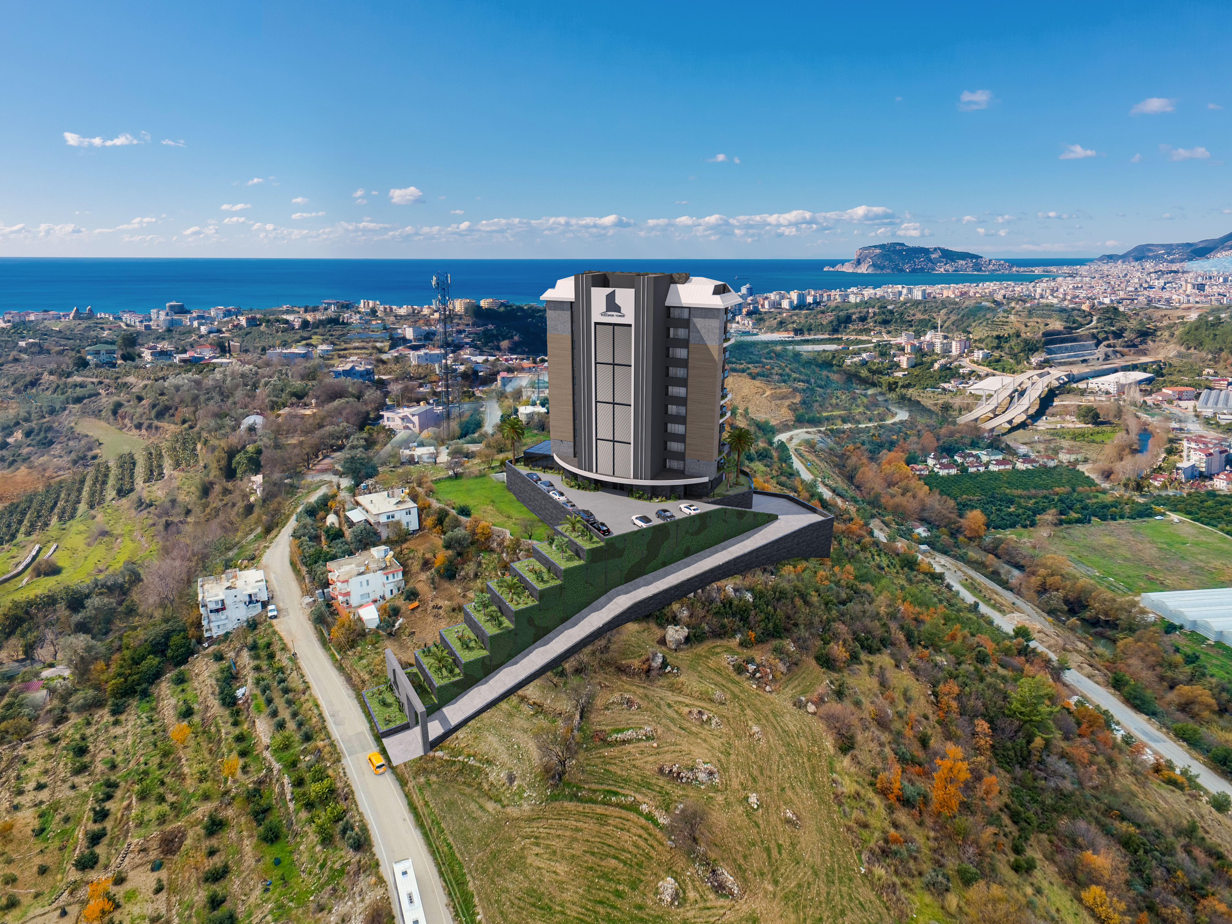 "Our project is located on an area of 3200 Mt² land situated in Kestel region. -The distance of our project to the sea is 2.3 km, and the distance to Alanya Keykubat University is 100 meters. -White goods and air conditioners are our gift for two months special for the launch.