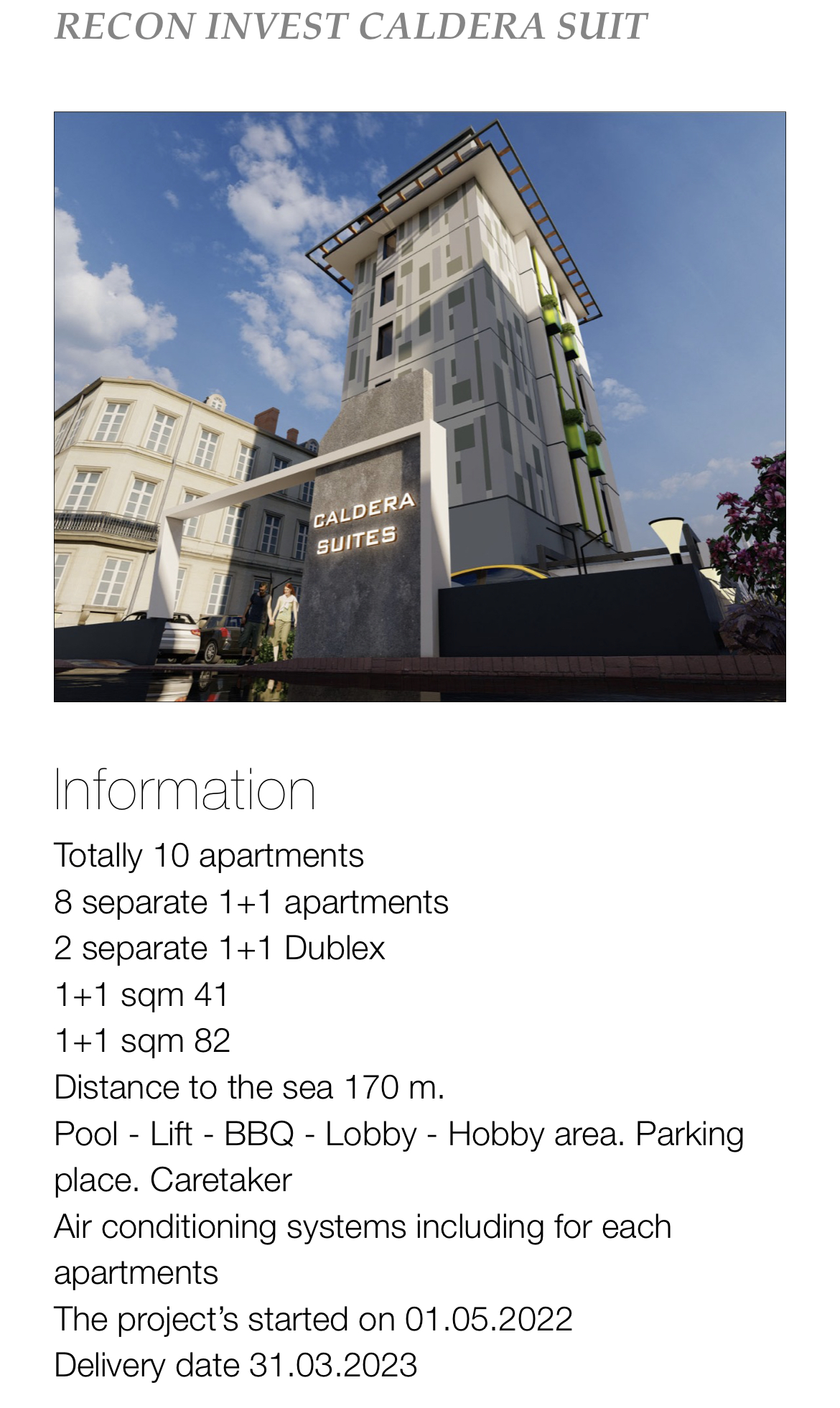 caldera suits have totaly 10 apartments.8 separate 1+1,2 separete 1+1 duplex. 1+1 sqm =41,1+1 sq=82 .Distance to sea is 170 m,,,project is eqiupped with all luxury accessories, Air conditioning system including every apartment, projects highlighted features are: