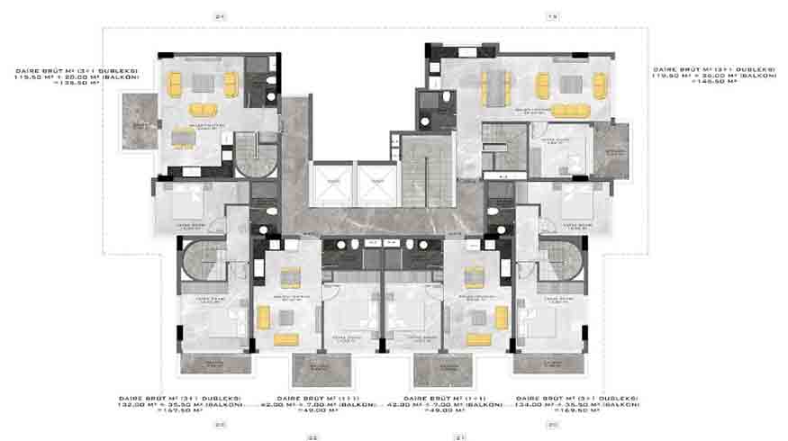 1+1 apartment,2+1 apartment, 2+1 and 3+1 garden floor duplex, 2+1 and 3+1 penthouse duplex