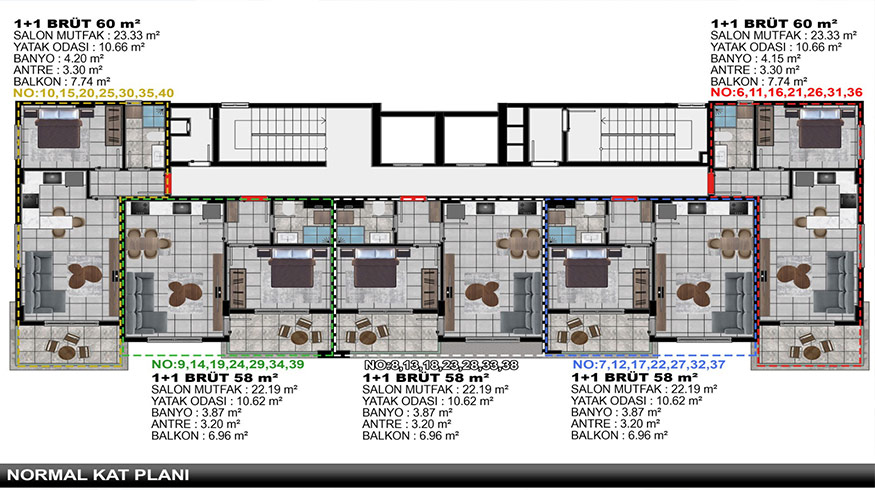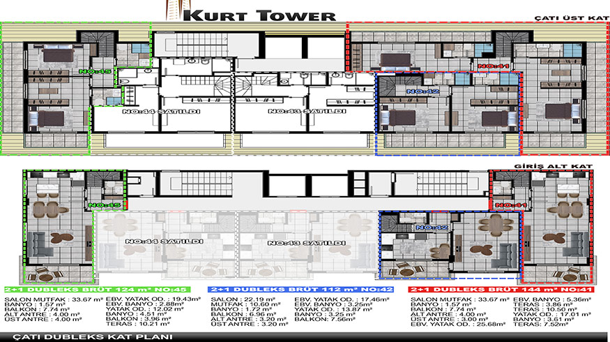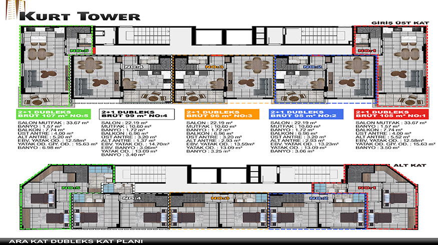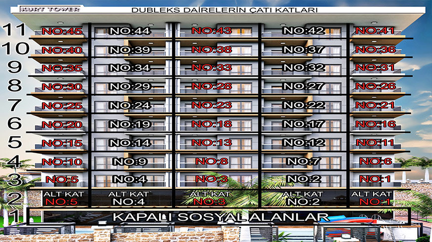 KURT TOWER is built on an area of 3.001 square meters . You will love being in KURT TOWER from the very first moment. There are different types of flats ranging from 1+1 flats suitable for all kinds of needs to large 2+1 duplex flats and spacious 2+1 mezzanine duplexes.