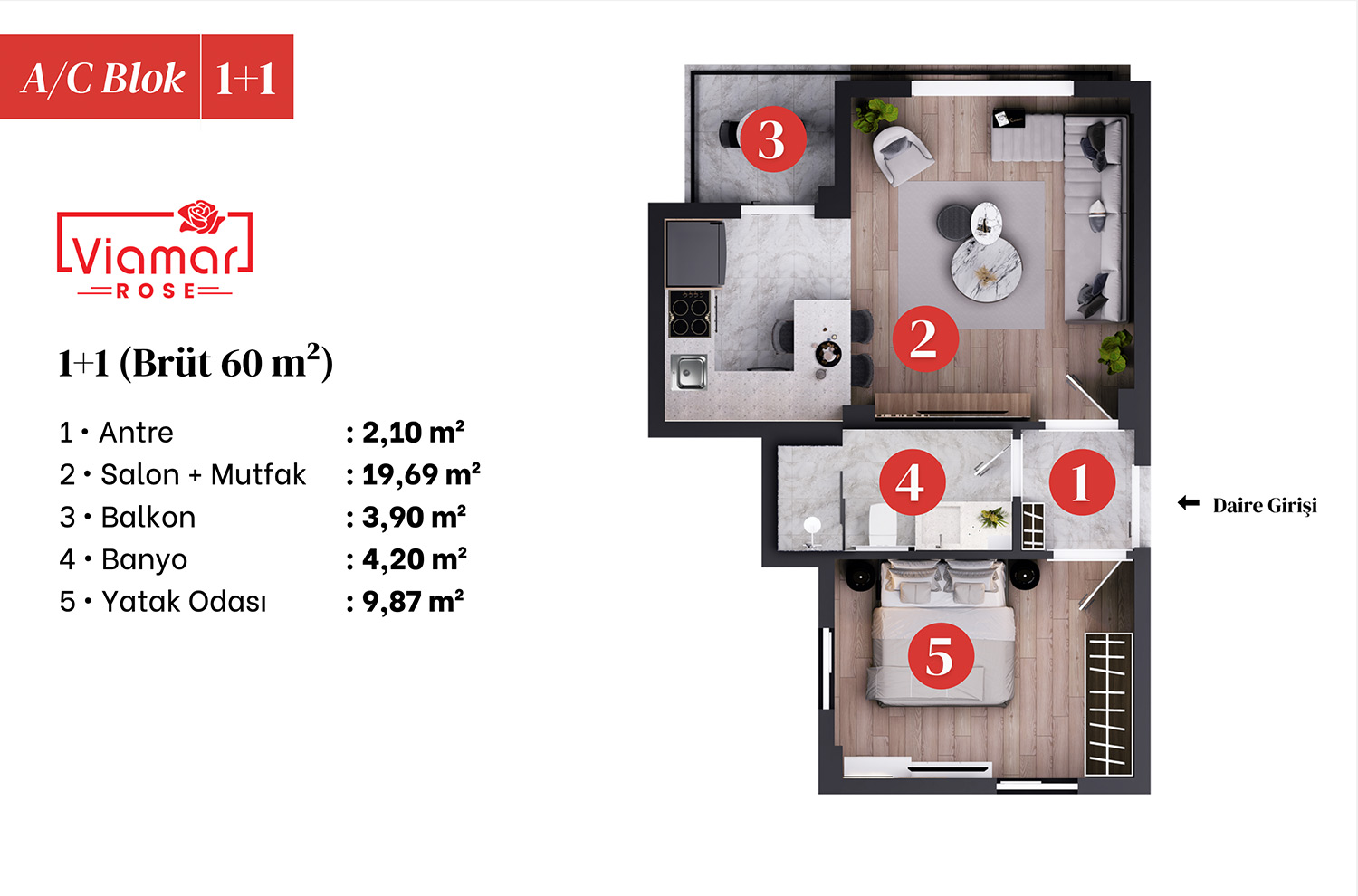 The fourth project of our Viamar series, Viamar Daisy is built over an area of 2.673 m² consisting of 2 blocks, 48 units of 1+1 apartments all with pool view. Whether you stay for a long time or rent it out after your holiday, Viamar Daisy promises a safe, modern, and enjoyable living space for you and your family!